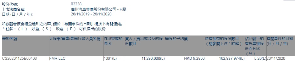 智通财经APP获悉,香港联交所最新资料显示,11月20日,FMR LLC增持广汽集团(02238)1129.6万股,每股作价9.2850港元,总金额约为1.05亿港元。增持后最新持股数目约为1.63亿股,最新持股比列为5.26%。