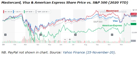 智通财经APP获悉,根据11月24日发布的最新交易量数据,以及自去年9月以来公司的其他进展,Librarian Capital分析了万事达(MA.US)的投资案例。自该机构在2019年3月将其评级定为“买入”以来,万事达的股票回报率已经达到46.5%(包括股息)。在2020年至今,其股票回报率为15.2%,超过了标准普尔500指数,远远超过了美国运通(AXP.US),但落后于PayPal(PYPL.US),后者的股价已经累计上涨了约90%。