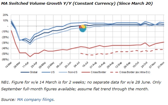 下图显示了万事达的交易量同比增长,包括最近4周(截至11月21日的一周):