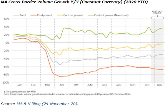 过去4周,万事达最新交易量数据显示出其从2020年第三季度开始相对稳定的趋势。尽管主要市场仍遭受卫生事件影响,但11月迄今,全球交易量仍同比增长约3%。 而受出行限制影响,跨境交易量与第三季度保持相同水平,