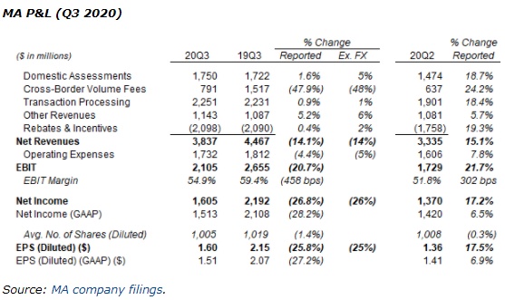 围绕卫生事件和经济的不确定性,管理层仍未提供业绩指引。虽然最近的交易量趋势略好于第三季度(同比增长3%,环比增长1%),但该机构预计第四季度的收入仅略好于第三季度。管理层预测,不包括并购和外汇支出,第四季度的支出将下降低个位数,但包括其在内支出将上升低个位数。基于以上因素,该机构预计万事达息税前利润将在2020年第四季度同比下降25%。