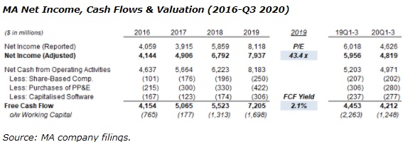 相对于2019年的财务状况,万事达股价为342.39美元,市盈率为43.4倍,自由现金流收益率为2.1%; 股息收益率为0.5%: