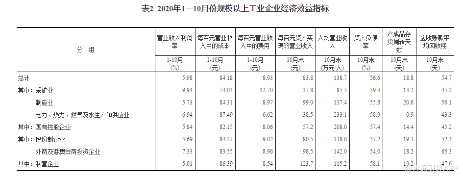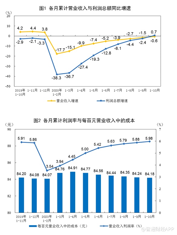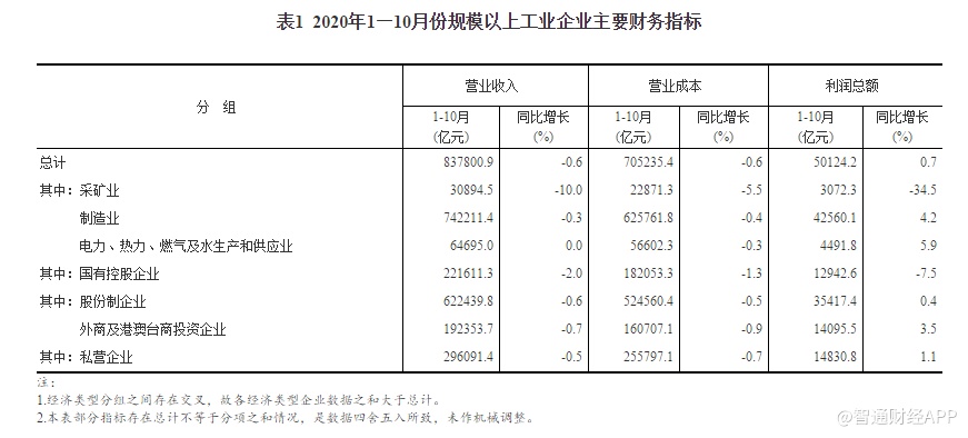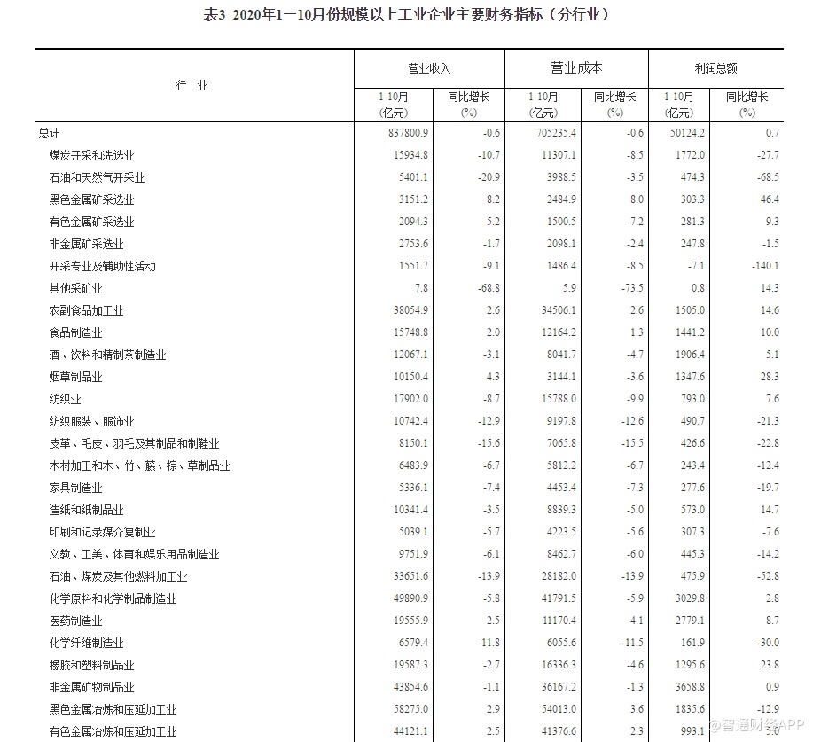 智通财经APP获悉,11月27日,国家统计局公布2020年1—10月份全国规模以上工业企业利润数据,具体如下: