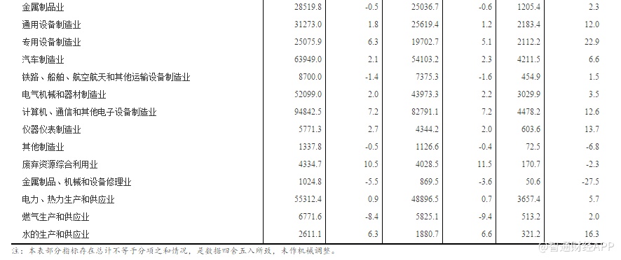 1—10月份,在41个工业大类行业中,25个行业利润总额同比增加,16个行业减少。主要行业利润情况如下:专用设备制造业利润总额同比增长22.9%,农副食品加工业增长14.6%,计算机、通信和其他电子设备制造业增长12.6%,通用设备制造业增长12.0%,纺织业增长7.6%,汽车制造业增长6.6%,电力、热力生产和供应业增长5.7%,有色金属冶炼和压延加工业增长5.0%,电气机械和器材制造业增长3.5%,化学原料和化学制品制造业增长2.8%,非金属矿物制品业增长0.9%;石油和天然气开采业下降68.5%,石油、煤炭及其他燃料加工业下降52.8%,煤炭开采和洗选业下降27.7%,黑色金属冶炼和压延加工业下降12.9%。