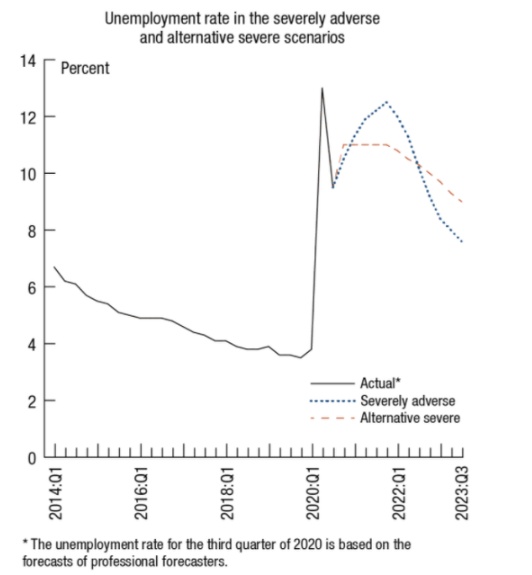 根据美联储发布的消息显示,此次对于华尔街银行的压力测试假设的是两个情境,其中一种情景是假设失业率为12.5%,国内生产总值(GDP)下滑3%,以及海外市场出现更大的混乱;而另一种情况则是受到持续时间较长但是程度较轻的冲击,也就是2020年底失业率达到11%峰值,然后下降至9%结束,GDP同步下滑2.5%左右。