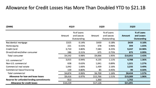 而美银在此前年中的压力测试表现如何?截至2020年6月30日,该行的CET1比率为11.4%,而最低要求为9.5%,因此其有能力来吸收上述情况导致的增量贷款损失。重要的是,如下图所示,压力测试假设的起点已经包括约210亿美元的贷款损失准备金,其中约110亿美元在2020年上半年得到确认: