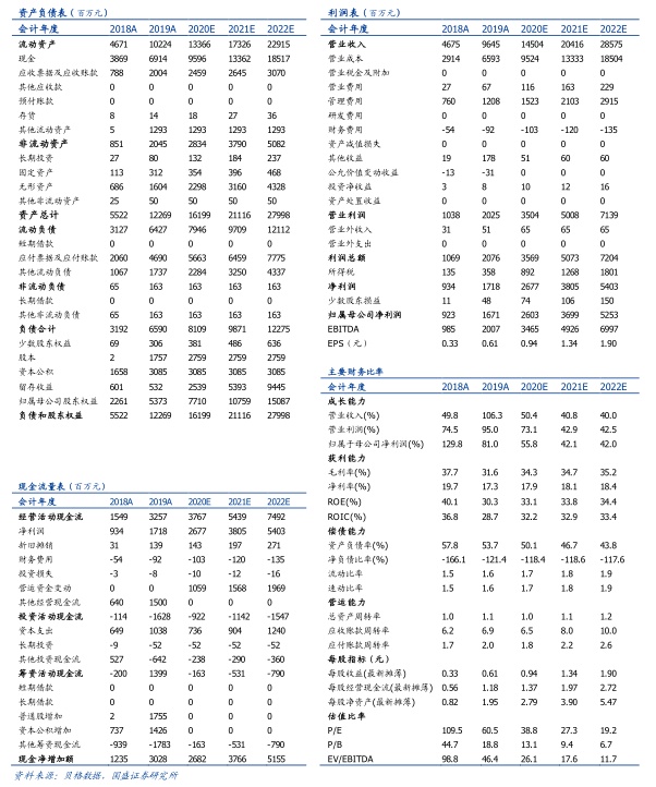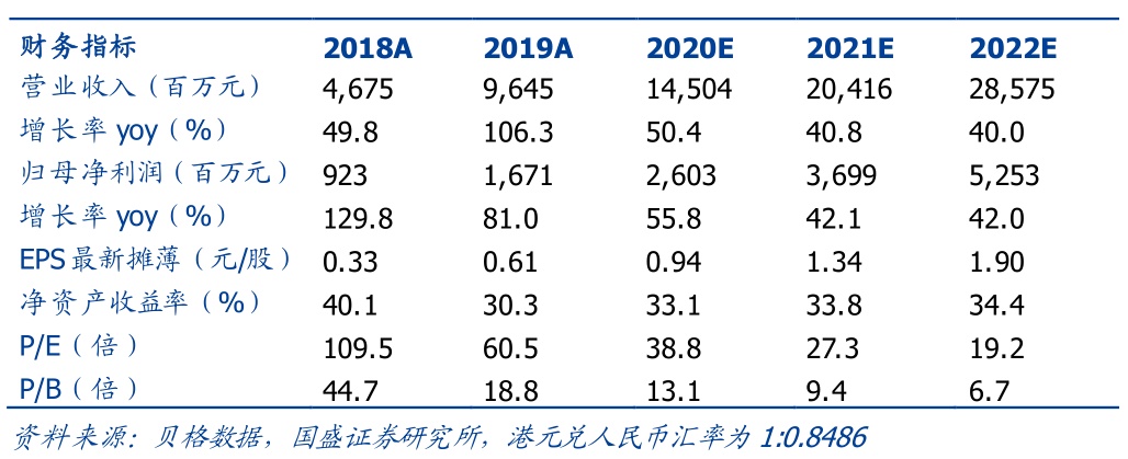 投资建议:我们预测公司2020-2022年的归母净利润分别为26.0/37.0/52.5亿元,同比增长55.8%/42.1%/42.0%,对应EPS分别为0.94/1.34/1.90元,2019-2022年CAGR为46.5%。当前股价对应2020-2022年PE分别为38.8/27.3/19.2倍,考虑到公司作为行业龙头,多个业务板块具备强劲竞争力,依托全新企业愿景未来有望延续良好的成长性。综合当前行业估值水平,维持目标价60.0港元(对应2021年40倍PE),维持“买入”评级。