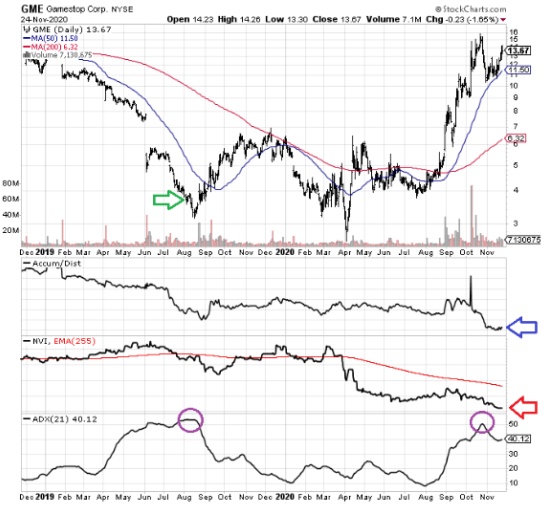 下图表示的是该股在2019年末触底的情况,Franke表示,绿色箭头指向的是该分析师在8月份对该股的最后一次看涨,当时的股价低于每股4美元。而目前的情况几乎与21日平均趋向指数(ADX)等指标所表现的相反。如图表底部所示,紫色圆圈代表的是ADX的极端位置,以及随后的动量骤减。虽然在2019年该股实现了真正的“超卖”点,但2020年10月至11月的情况似乎预示着中期内该股已经处于“超买”状态。