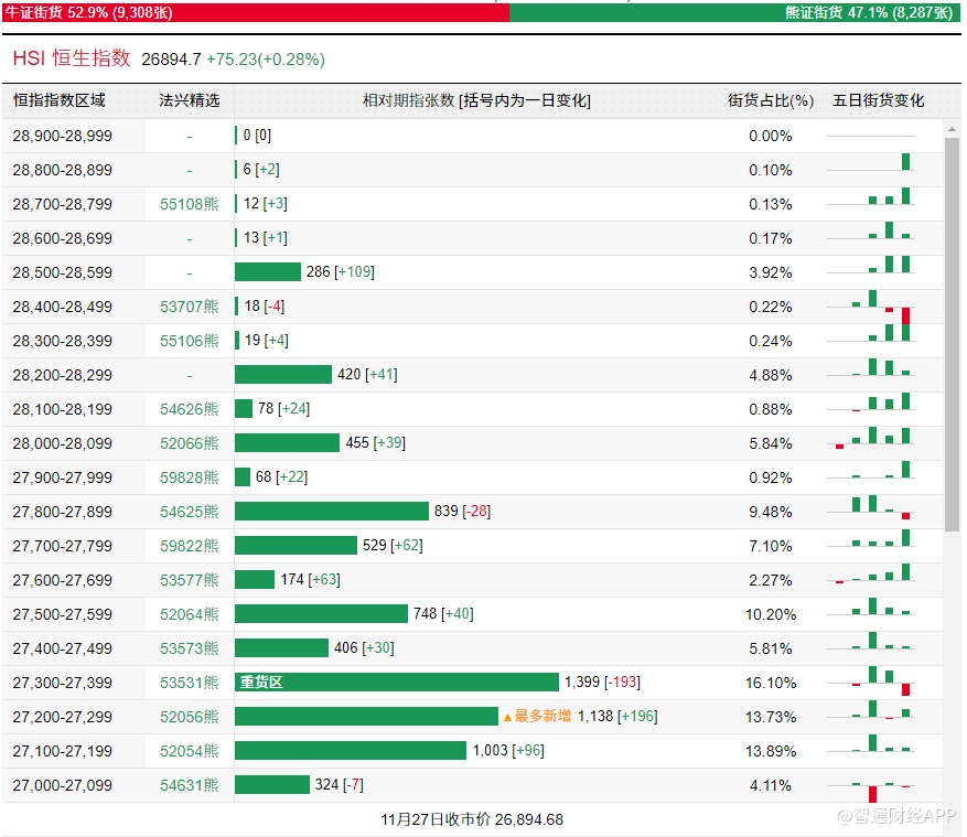 智通财经APP获悉,截至11月27日,恒指最新的牛熊街货比例53:47。法兴恒指牛熊证街货分布图中的数据显示,熊证街货重货区在27200-27299区间,该区间最新熊证数量为1138张,较上一交易日增加196张;最多新增也在该区域。牛证街货重货区在26400-26199区间,该区间最新牛证数量为400张,较上一交易日增加96张,最多新增也在该区域。