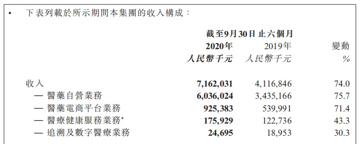 在2020年4月1日至9月30日的半年间,阿里健康实现总营收为71.62亿元,同比增长74%;净利润调整前为2.79亿元,而去年同期则亏损为760万元,经调整后净利润为4.36亿元,同比暴增286.4%。