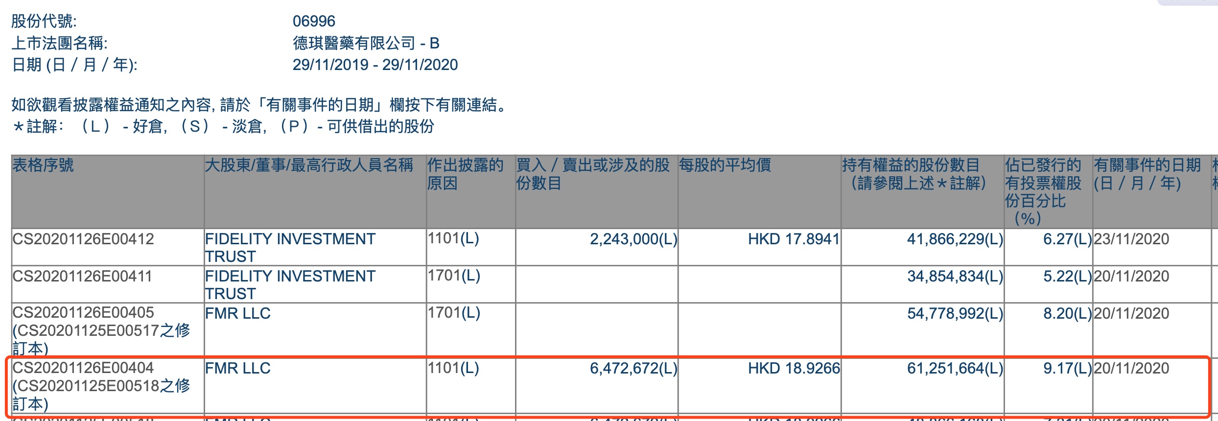 智通财经APP获悉,香港联交所最新资料显示,11月20日,FMR LLC增持德琪医药-B(06996)647.27万股,每股作价18.93港元,总金额约为1.23亿港元。增持后最新持股数目约为6125.17万股,最新持股比例为9.17%。