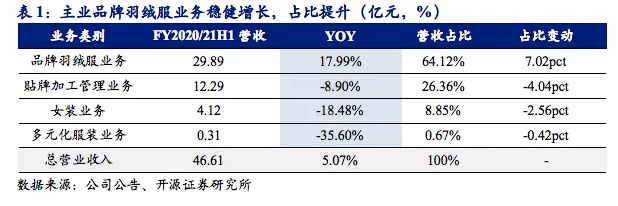 FY2020/21上半年公司品牌羽绒服业务实现收入29.9亿元(+18.0%),占总收入64.1%(+6.9pct)。在聚焦主航道战略下,公司继续做强品牌羽绒服核心业务,主业保持稳健增长,收入占比持续提升。