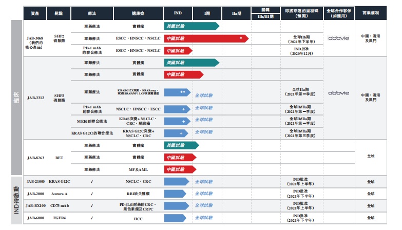除SHP2及KRAS抑制剂外,加科思的在研项目包括临床阶段溴结构域和超末端结构域(BET)抑制剂JAB-8263以及处于早期阶段的靶向涉及癌症的若干主要和关键癌症信号通路(包括RB、肿瘤免疫及肿瘤代谢信号通路)的几种候选药物,并有望在全球各自药物类别中成为首批进入市场的药物产品之一。