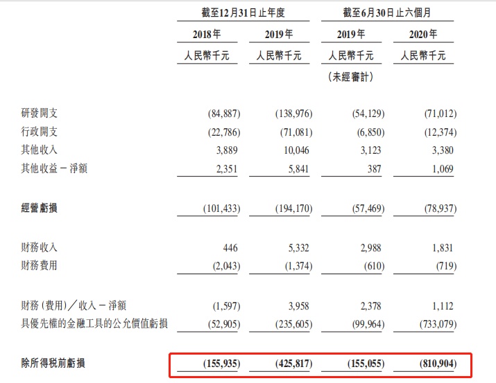 目前,加科思的产品尚未获准进行商业销售,加科思尚未从产品销售产生任何收入。自公司成立以来,加科思概未盈利并持续产生亏损。于2018年、2019年以及截至2019年及2020年6月30日止六个月期间,亏损分别为人民币1.56亿元、人民币4.26亿元、人民币1.55亿元及人民币8.11亿元。