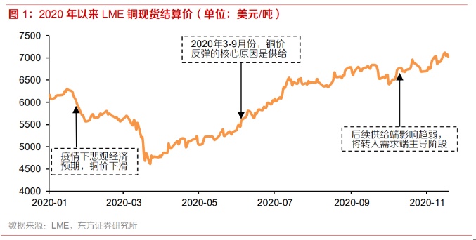 2020 年以来铜价经历深 V 反弹:卫生事件下极度悲观的经济预期带动 LME 铜价从 1 月 16 日的 6300.50 美元/吨下跌 27%至 3 月 23 日的 4617.50 美元/吨;4-9 月份 南美产铜大国产量受卫生事件干扰供给持续紧张后,铜价强势反弹至 6800 美元/吨一 线;10-11 月份产铜大国逐步恢复供给,在经济复苏的预期下铜价继续上行,于 11 月 20 日升至 7261.0 美元/吨。铜价转入需求端主导阶段,明年走势如何判断?本文将从需求和供给两方面展开分析。