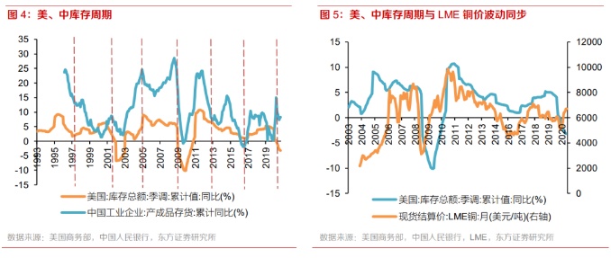 历史经验看,美国和中国库存周期是国际铜价的同步指标。美国、中国为全球经济最重要的“发动机”,同时也是全球制造业产成品最重要的“输出国”和“输入国”,其库存周期能够有效反映全球制造业的库存周期。自1997年以来,美国、中国已清晰的经历了1997-2001、2001-2005、2005-2009、2009-2013、2013-2016、2016-2019年完整的六轮库存周期,每轮周期跨度约为3-4年左右。受卫生事件影响,美国新一轮库存周期上升周期确认时间推迟至2020年7月。而中国工业企业产成品库存在2020Q1受到卫生事件和春节因素影响提前回升,但实际新一轮库存周期上升周期确认时间也为2020年7月左右。从美、中库存周期与LME铜的波动规律来看,两者基本为同步指标,其反映的是美国、中国工业部门在去库-补库波动中对铜原料的需求波动。