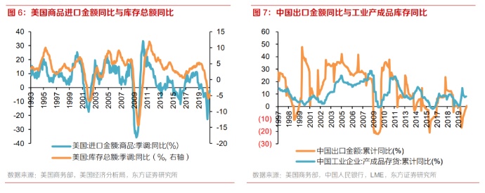 美国商品进口金额、中国出口金额是库存周期与国际铜价的前置指标,领先约6个月-1年左右。美国和中国是全球制造业产成品最重要的“输入国”和“输出国”,因此其商品进出口是美国、中国库存周期形成的驱动因素。从1993年至今的指标来看,美国商品进口金额同比和中国出口金额同比分别领先于库存同比约6个月-1年左右。故国际铜价一个较好的前置指标即为美国商品进口金额同比或中国出口金额同比。规律上看,美国商品进口同比自2019年10月理应进入上升周期,但受卫生事件打断自2020年5月才触底回升,从而推动美国库存周期进入主动补库周期。中国出口情况与库存周期关系也类似。