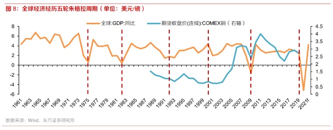 朱格拉周期以资本特别是设备更新换代为驱动,是典型中周期经济规律,其平均周期长度约为8-10年,全球GDP增速可以较好表征朱格拉周期的波动。自1975年以来,全球经济大约经历了五轮朱格拉周期,即1975-1982、1983-1992、1993-2000、2001-2008、2009-2019。铜作为下游设备、建筑、基建等固定资产投资的重要原料,其价格再长周期内也基本服从GDP增速的周期波动。