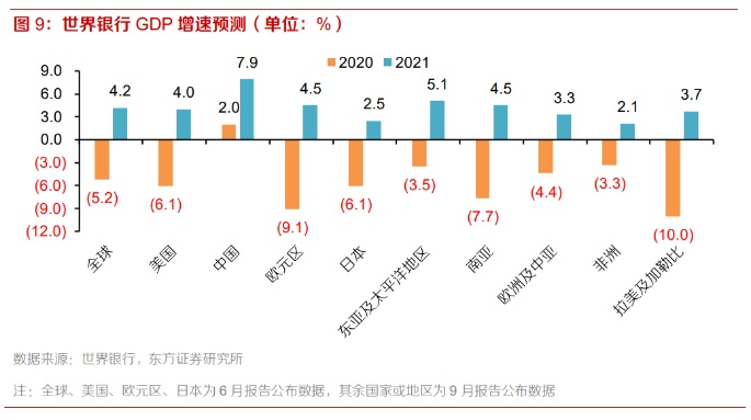 卫生事件重创全球经济,2021年全球经济或将迎来复苏,我们预计新一轮朱格拉周期上升期或开启,从而带动铜终端需求。根据世界银行分别于2020年6月和9月发布的经济增长预测报告,受卫生事件爆发和蔓延影响,2020年全球经济遭到重创,GDP增速预计仅为-5.2%,增速创1961年以来新低。分国家或地区看,中国2020年GDP或实现正增长为2.0%,美国2020年GDP或为-6.1%,欧元区或为-9.1%,日本或为-6.1%。2021年,随着疫苗面世和全球主要经济体经济大规模经济刺激计划的退出,全球经济或将迎来复苏。根据世界银行预测,2021年全球GDP增速预计将达4.2%。其中,中国2021年GDP增速或为7.9%,美国或为4.0%,欧元区或为4.5%,日本或为2.5%。全球经济复苏预期将驱动工业部门固定资产投资回升,我们预计新一轮朱格拉周期上升期或开启。