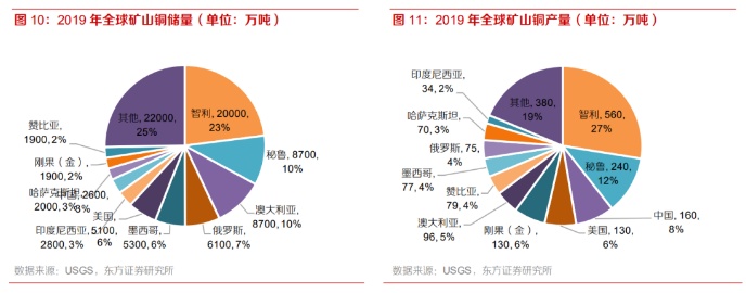 全球铜矿资源主要集中于智利、秘鲁等几个国家,开采、冶炼产能相对集中。根据USGS数据,2019年智利、秘鲁矿山铜储量分别为20000万吨、8700万吨,产量分别为560万吨、240万吨,均处于全球一、二位,储量共占全球的33%,产量共占39%。2019年中国矿山铜储量为2600万吨,占比为3%,产量为160万吨,占比8%。