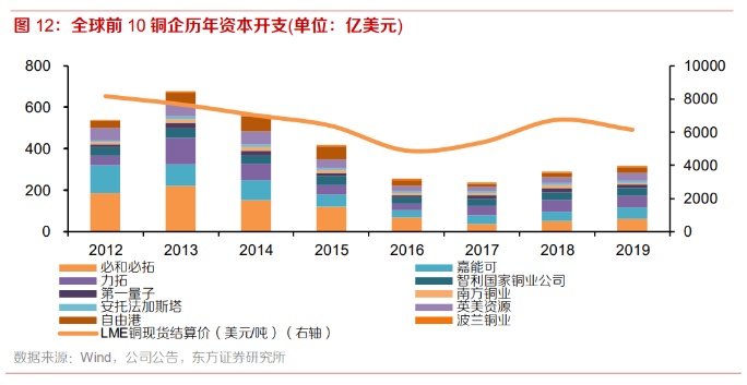 近年来主流铜矿资本开支仍低位运行,未来铜矿供给增量有限。我们统计了全球产量排名前10的铜企2012-2019年资本开支情况。可见,主流铜矿资本开支在2013年达到顶峰,达676.9亿美元,同比大幅上升25.2%。之后资本开支即逐年逐渐下降,2017年降至最低值水平,为237.9亿美元。2018-2019年主流铜矿资本开支企稳反弹,2019年达318.6亿美元,同比上升10.4%,但仍在低位运行。