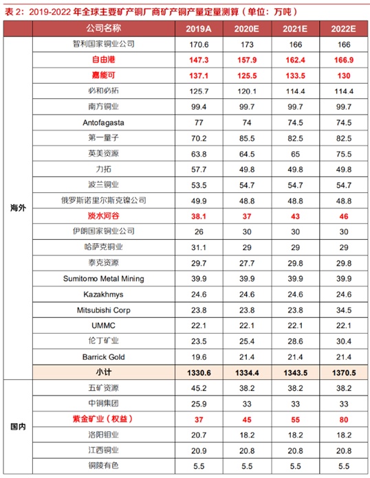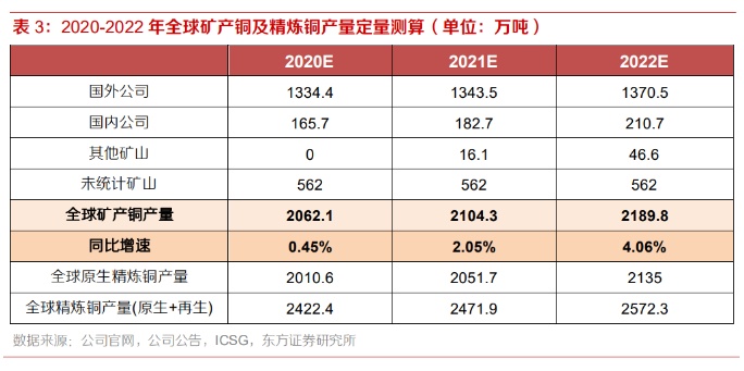 近三年原生精炼铜占矿产铜比例稳定在97%附近。近3年来原生精炼铜在矿产铜产量中的占比较为稳定,保持在97.1%至97.5%之间。因此,我们假设未来三年该占比与2019年保持一致为97.5%。在下文中,我们将通过统计2020-2022年全球矿产铜主要厂商及新增主要矿山的预测产量,预测2020-2022年全球矿产铜总产量,进而按照97.5%的占比对全球原生精炼铜产量进行预测。