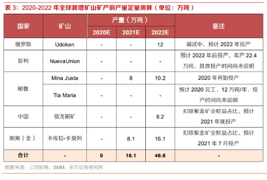扣除以上28家主流矿山权益产量后,预计2021-2022年全球其他矿山新增矿铜产量分别为16.1万吨、46.6万吨。根据公司官网以及SMM资讯,2021年新增矿山主要为秘鲁的Mina Justa矿山和刚果金的卡库拉-卡莫阿铜矿(扣除紫金矿业权益部分);2022年新增矿山主要为俄罗斯的Udokan铜矿、国内的驱龙铜矿(扣除紫金矿业权益部分)和刚果金的卡库拉-卡莫阿铜矿(扣除紫金矿业权益部分)。扣除以上28家主流矿山权益产量后,预计2021-2022年全球其他矿山新增矿铜产量分别为16.1万吨、46.6万吨。