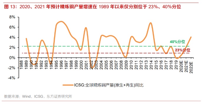 由上述分析可见,2020年卫生事件较大程度上影响了全球矿产铜及精炼铜产量,其同比增速仅为0.45%。随着卫生事件在主要矿产国得到控制和部分世界级矿山的投产,预计2021-2022年全球矿产铜及精炼铜产量同比增速将有所加快。然而,如若观察全球精炼铜产量同比增速历史变化,可知2020、2021年预计增速0.45%、2.05%在1989年以来仅分别位于23%、40%分位,2022年预计增速4.06%则位于66%分位。