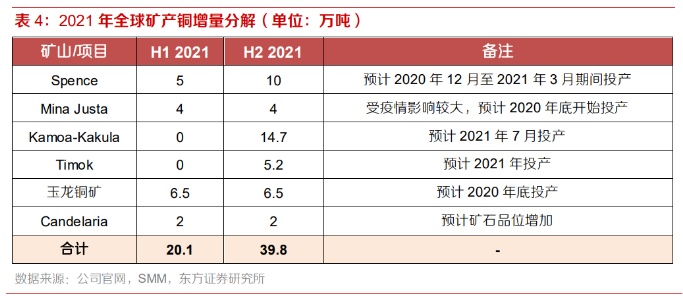 2021年新增产量或主要集中于下半年, 新增产量中上半年:下半年 = 3:7。2021年的新建矿山投产与旧矿山技改扩产项目合计新增约59.9万吨矿产铜产量,但智利国家铜业公司及必和必拓由于矿山老化、矿石品位下降等原因降低了其预测产量,因此2021年的全球矿产铜总产量相比于2020年预计增加42.2万吨。根据新建矿山投产进度测算,2021年上半年矿产铜产量增量约为20.1万吨,下半年矿产铜产量增量约为39.8万吨,新增产量中上半年:下半年 = 3:7,新增产量主要集中于2021年下半年。