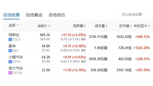 新能源汽车股继续狂飙!特斯拉(TSLA.US)市值超4.3万亿港元,远超丰田稳坐全球市值第一车企宝座。蔚来今年股价飙升1243%,市值超5600亿港元,远超奔驰母公司戴姆勒。上市仅仅4个月的小鹏汽车市值也超3500亿港元,力压老牌车企福特。