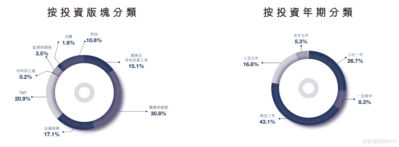 可见,在不确定的市场环境中,东英金融更为谨慎,在降低负债的同时增强资金流动性,以降低运营风险并挖掘潜在的优质投资机会。目前,东英金融投资组合的前三大领域分别为医疗与健康、TMT及金融服务,三者的占比分别为30.8%、20.9%、17.1%。而从投资年限上看,43.1%的资产投资时间在2至3年内,3至5年的16.6%,超过5年的为5.3%,少于1年的为26.7%。这说明东英金融的资产配置当前偏重于中、短期。