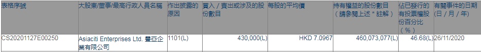 智通财经APP获悉,香港联交所最新资料显示,11月26日,丰亚企业有限公司增持时代邻里(09928)43万股,每股作价7.0967港元,总金额约为305.16万港元。增持后最新持股数目约为4.6亿股,最新持股比例为46.68%。