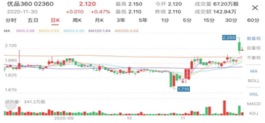 然而,优品360的半年报业绩并没有引起市场特别关注,11月27日公司股价表现为冲高回落,最高涨幅接近12%,收盘回落至上涨4.98%。11月30日,公司股价也仅以轻微上涨0.47%收盘。