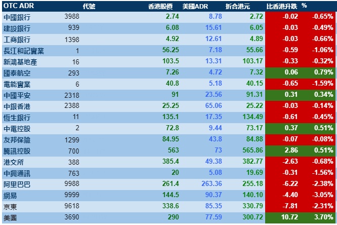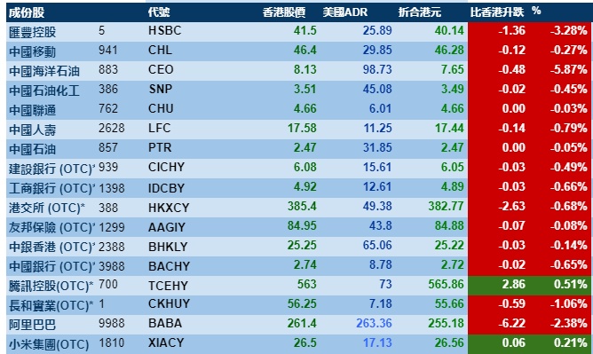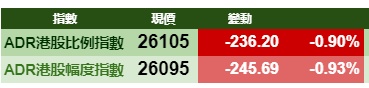 智通财经APP获悉,周一美股三大股指齐跌,连累港股ADR指数走软,按比例计算,收报26105点,跌236.2点或0.9%。