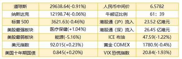 1、 隔夜美股截至收盘,道指收盘下跌271.73点或0.91%,报29638.64点;纳指跌7.11点或0.06%,报12198.74点;标普500指数跌16.72点或0.46%,报3621.63点。在11月份,道指累计上涨11.8%,录得1987年以来最佳11月同期表现,纳指上涨11.8%,标普500指数上涨10.8%。港股ADR指数走软,按比例计算,收报26105点,跌236.2点或0.9%。
