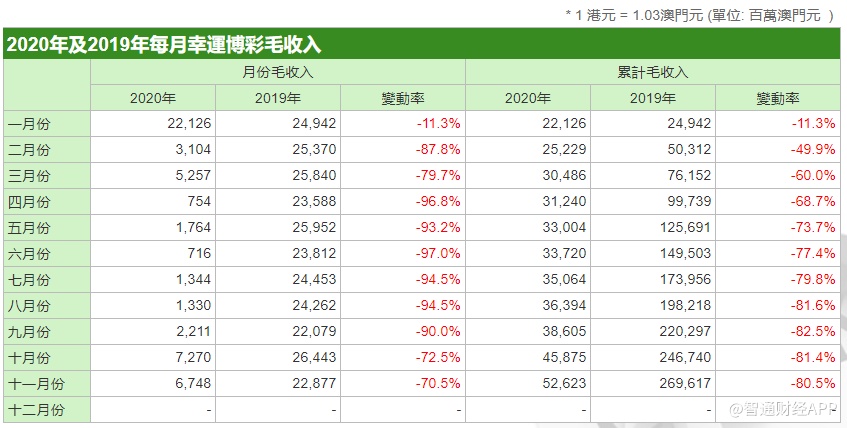 澳门今年1-11月份幸运博彩毛收入526.23亿澳门元,同比下降80.5 %。
