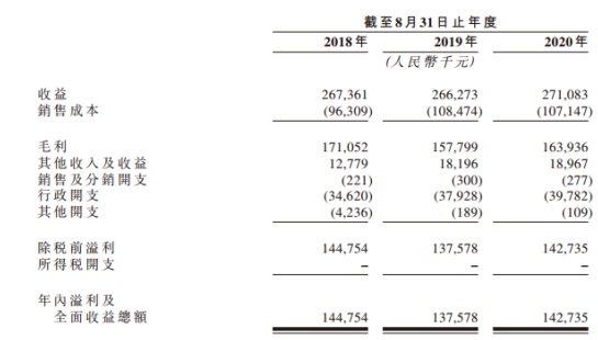 财务方面,该公司收益于往绩记录期大致保持稳定,由截至2018年8月31日止年度的人民币2.674亿元轻微减少至截至2019年8月31日止年度的人民币2.663亿元,随后增至截至2020年8月31日止年度的人民币2.711亿元。毛利由截至2018年8月31日止年度的人民币1.711亿元减少至截至2019年8月31日止年度的人民币1.578亿元,并增至截至2020年8月31日止年度的人民币1.639亿元。年内溢利及全面收益总额由截至2018年8月31日止年度的人民币1.448亿元减少至截至2019年8月31日止年度的人民币1.376亿元,并增至截至2020年8月31日止年度的人民币1.427亿元。