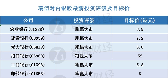 报告中称,以估值计,平安银行及招商银行(03968)近期上涨得较快,认为邮储银行(01658)及光大银行(06818)的估值似乎更具吸引力,继续推荐四大内银,依次看好工商银行(01398)、农业银行(01288)及建设银行(00939),均予“跑赢大市”评级。
