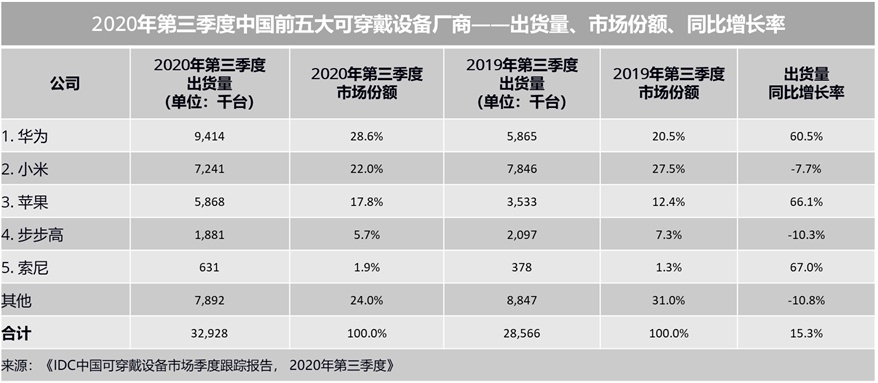 智通财经APP获悉,IDC《中国可穿戴设备市场季度跟踪报告,2020年第三季度》显示,2020年第三季度中国可穿戴设备市场出货量为3293万台,同比增长15.3%。基础可穿戴设备(不支持第三方应用的可穿戴设备)出货量为2616万台,同比增长16.6%,智能可穿戴设备出货量为677万台,同比增长10.6%。