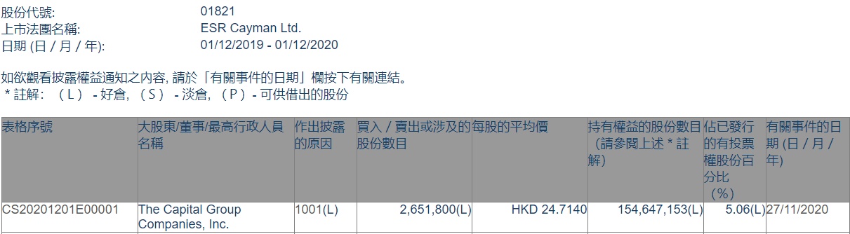 智通财经APP获悉,香港联交所最新资料显示,11月27日,The Capital Group Companies, Inc增持ESR(01821)265.18万股,每股作价24.714港元。总金额为6553.66万港元,增持后最新持股数目约为1.55亿股,最新持股比例为5.06%。