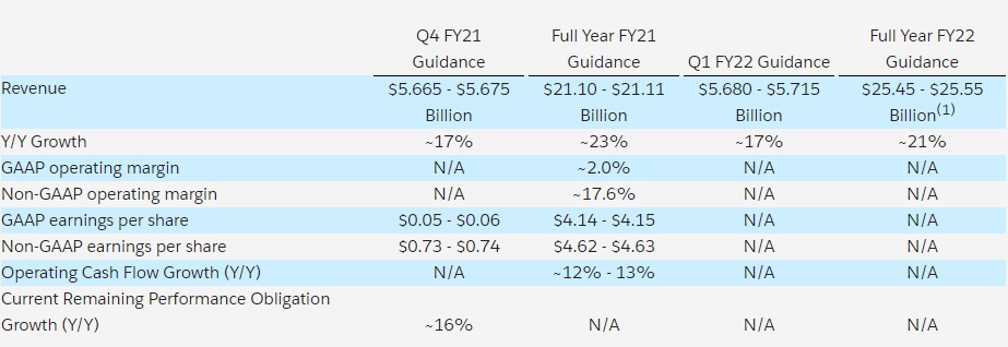该公司预计第四财季营收为56.65亿-56.75亿美元,同比增长约17%;预计2021财年营收211亿-211.1亿美元,同比增长23%;预计2022财年第一季度营收为56.8亿-57.15亿美元,同比增长约17%;预计2022财年营收为254.5亿-255.5亿美元,同比增长约21%,其中包括有关收购Slack(WORK.US)约6亿美元。