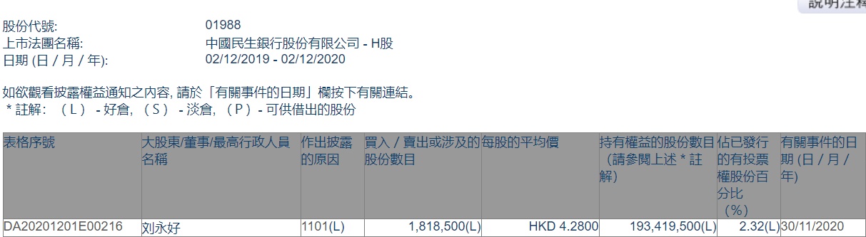 智通财经APP获悉,香港联交所最新资料显示,11月30日,民生银行副董事长刘永好增持民生银行(01988)181.85万股,每股作价4.28港元。总金额约为778.32万港元,增持后最新持股数目约为1.93亿股,最新持股比例为2.32%。