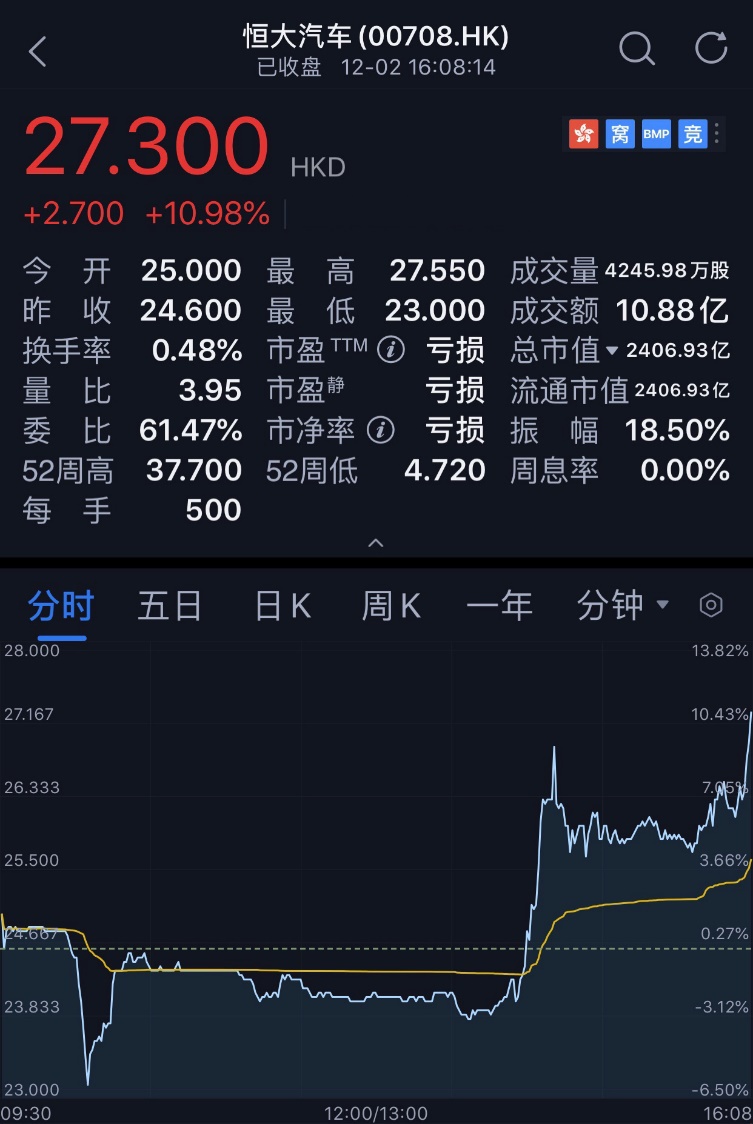 智通财经APP获悉,据港交所最新权益披露资料显示,恒大汽车(00708)于12月2日获大股东中国恒大(03333)增持2542.7万股,合计6.6亿港元。