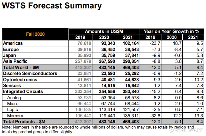 WSTS还预计,2021年全球半导体市场将增长8.4%,达到4694亿美元,有望创下历史新高。受内存和光电子两位数增长的推动,预计其他所有产品类别也将呈现正增长,预计2021年所有地区都将实现增长。WSTS预计,除了小部分光电和分立半导体之外,今年几乎所有类别的半导体都有增长。