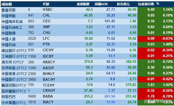 大型蓝筹涨跌不一,汇丰控股收报42.99港元,较港收市涨1.16%;腾讯控股收报579.83港元,较港收市涨1.02%。
