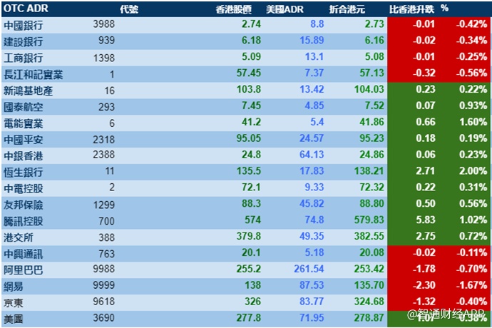 智通财经APP获悉,周三美股三大股指涨跌不一,标普收盘续创新高,港股ADR指数继续上涨,按比例计算,收报26680点,涨138.47点或0.52%。