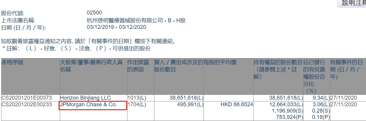 智通财经APP获悉,香港联交所最新资料显示,11月27日,摩根大通减持启明医疗-B(02500)49.5991万股,每股作价66.6524港元。总金额约为3305.9万港元,减持后最新持股数目约1266.4万股,最新持股比例为3.06%。