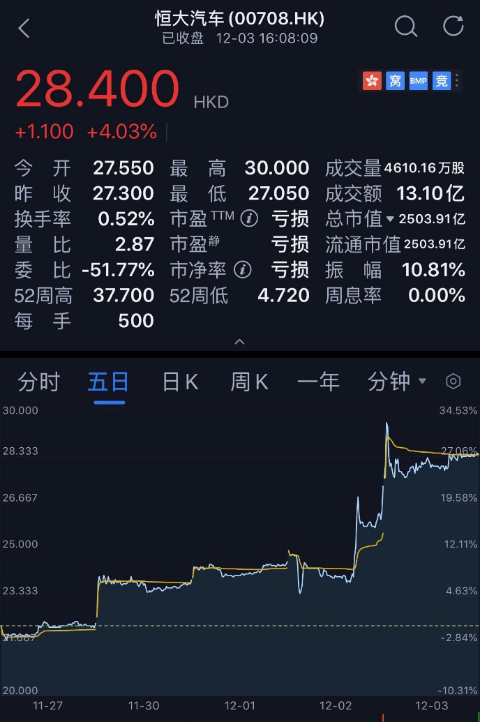 受此利好消息影响,恒大汽车股价持续飙升。继昨日收盘大涨11%后,今日继续走高,盘中最高涨幅超9%,创近三个月新高,收盘收报于28.4港元,两天累计涨幅达14%。