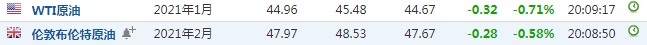 截至发稿,WTI原油跌0.71%,报44.96美元/桶。布伦特原油跌0.58%,报47.97美元/桶。