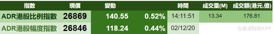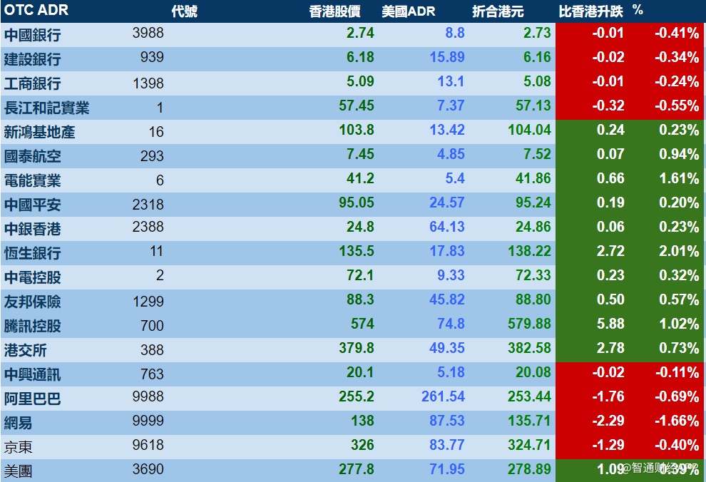 智通财经APP获悉,周四美股三大股指涨跌不一,港股ADR指数继续上涨,按比例计算,收报26869点,涨140.55点或0.52%。
